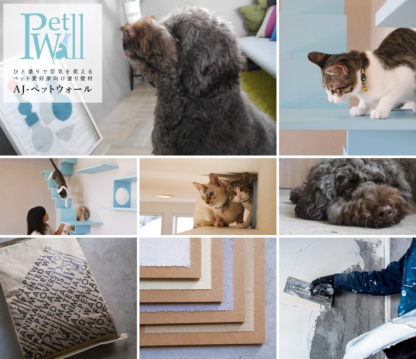 AJ-ペットウォールの効果 / 8種類の成分 / カラーバリエーション / 施工例 / 商品概要 / お問合せ