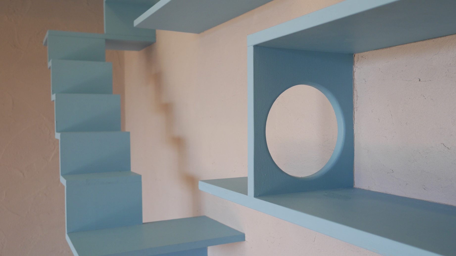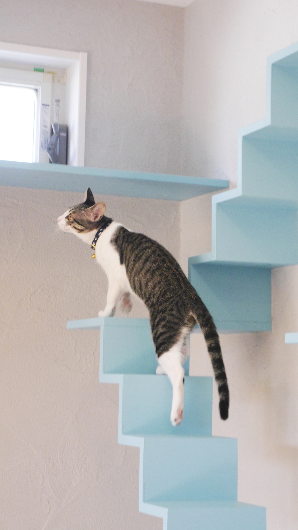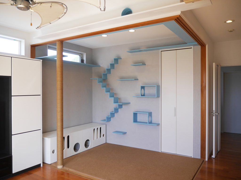 和室部分のキャットウォークは、猫の印象的な瞳の色に合わせたブルー。塗り壁材はグレーを選んだ。