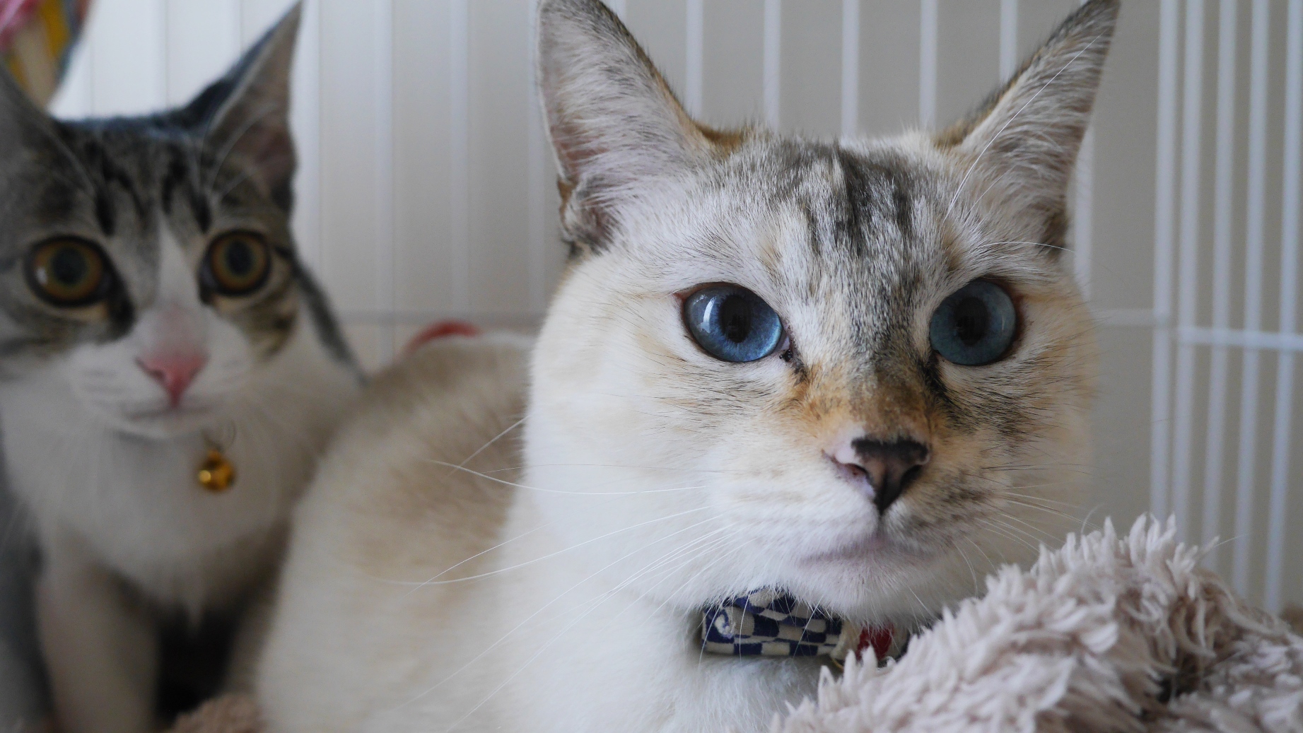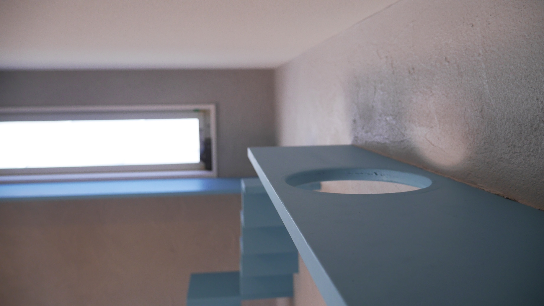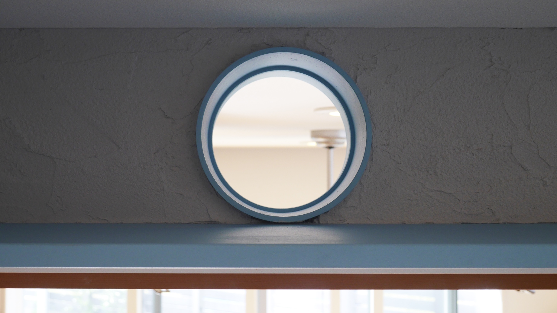 和室部分のキャットウォークは、猫の印象的な瞳の色に合わせたブルー。塗り壁材はグレーを選んだ。