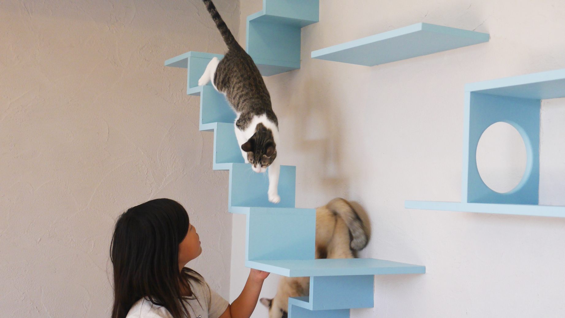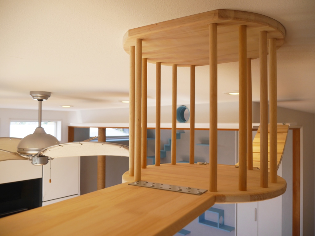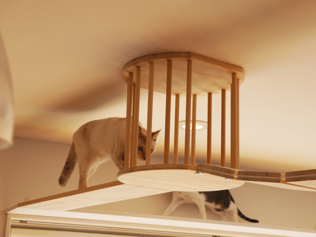 猫たちの遊び場と、人の生活空間のメリハリと調和を細やかに設計するデザインを目指した。