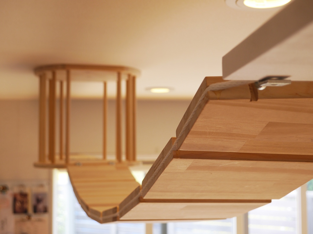 家族の集まるリビングの天井に渡した吊り橋はナチュラルな木目を生かして制作した。