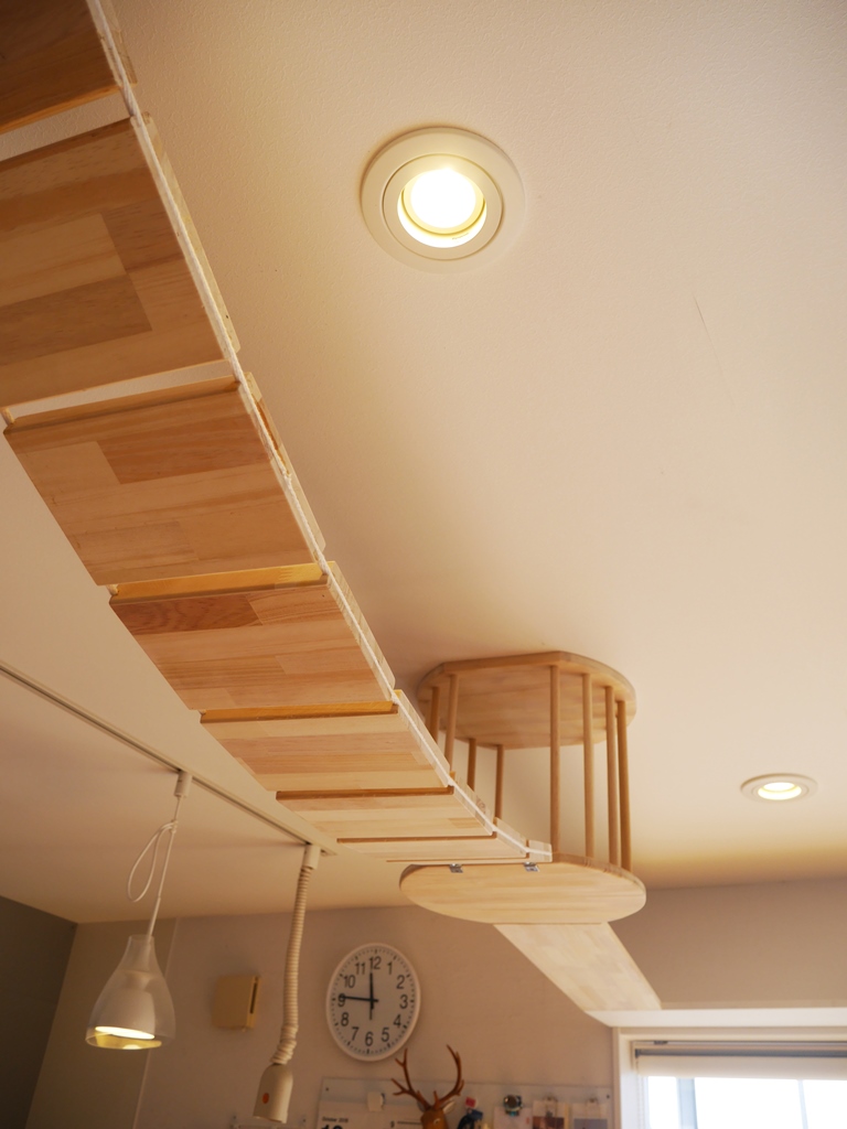 和室からリビングへ抜けるくぐり穴を設け、リビング全体を一周出来るよう部屋の中心に吊り橋を渡した。