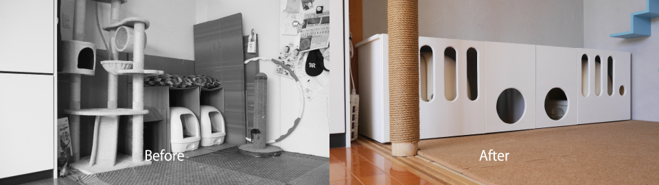 衛生面を考慮し、食事と排泄のスペースを分離する為の猫トイレ置き場の内壁にも「AJ-ペットウォール」を使用。