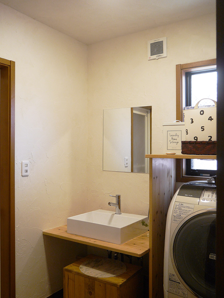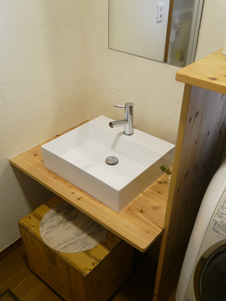 洗面台はシンプルなスクエアのボウルと木材でオリジナルを制作。洗濯機がすっぽりとはまるサイズの物置台を設置し、スペースを有効活用。