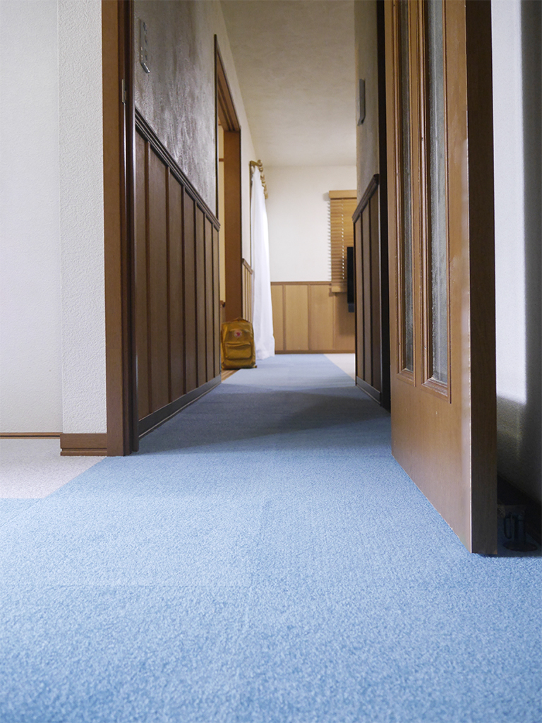 階段部分にも青系のカーペットを敷き、家の中を走り回る元気な小型犬の足腰を守る理想的なペットフロアが完成。