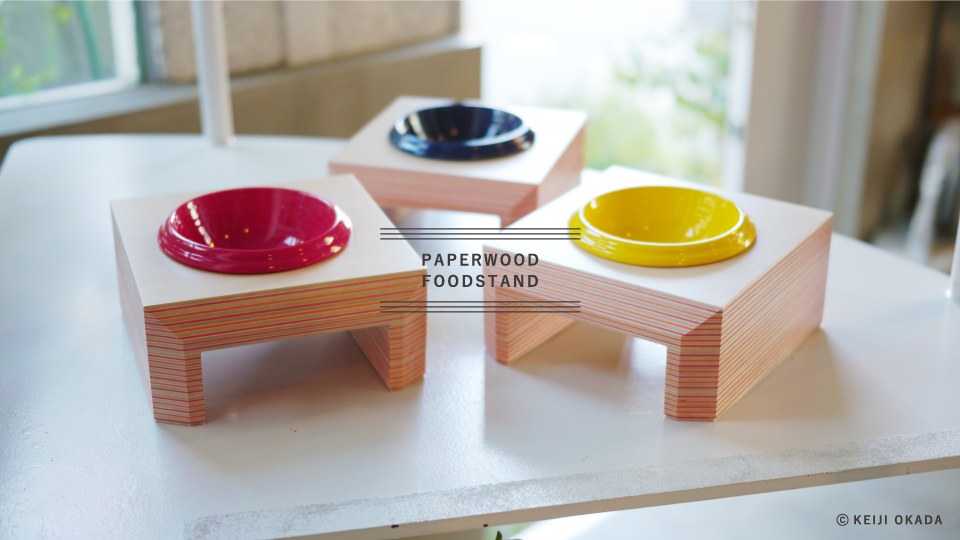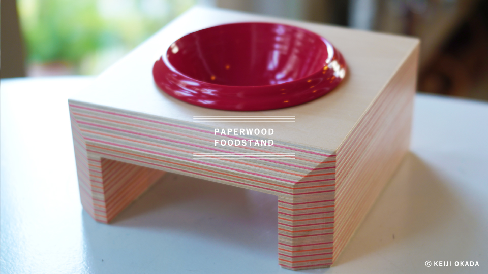 白樺の間伐材と色紙を重ねて圧着させてペーパーウッドを使用した小型犬用のボウルスタンド。